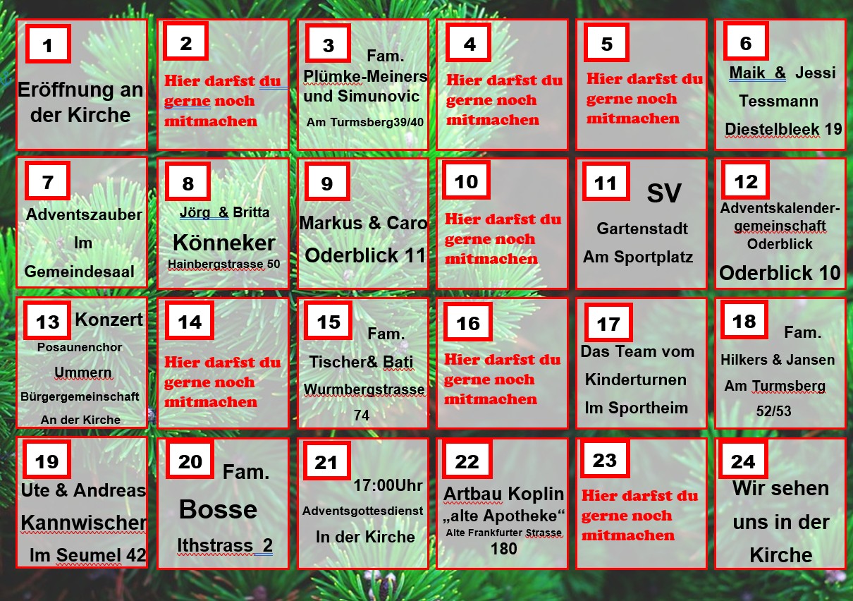 Lebendig wird der Adventskalender durch uns. Je mehr Familien sich freuen, mitzumachen, umso lebendiger wird der Advent in unserer Gartenstadt. Es gibt keine Vorgaben, sondern jeder Gartenstädter gestaltet einen Abend nach seinen Vorstellungen. Ob lang oder kurz, ob mit Glühwein oder ohne, ob mit Snacks oder ohne…Hauptsache wir haben im Dezember tolle Begegnungen und können uns gemeinsam auf Weihnachten freuen!